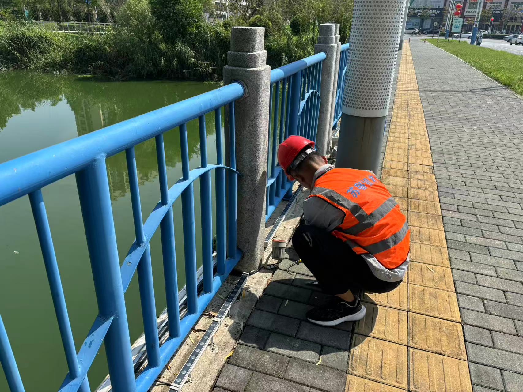 為民河、利民河沿岸、環(huán)形景觀帶及蘇州公園等區(qū)域的景觀燈也是重點排查對象。華燈初上,維護人員按照步巡計劃,沿河逐段細(xì)致檢查。他們對RGB全彩洗墻燈、景觀柱燈、抱樹燈等的運行狀態(tài)進行全面檢測:俯身檢查線路外皮是否因高溫開裂,確認(rèn)沿河燈具安裝牢固程度,并對損壞燈具及時更換。
