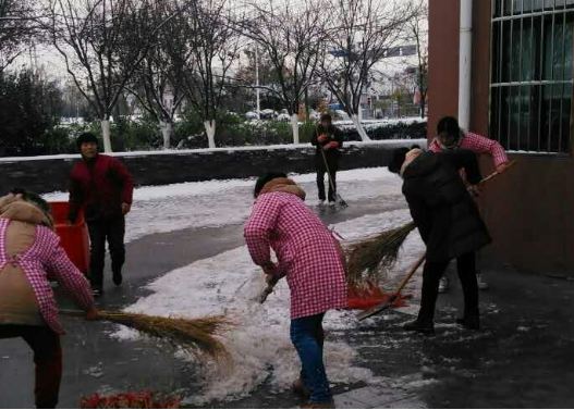 次日氣溫驟降,零下4度,多數(shù)路面存在結(jié)冰現(xiàn)象,加上路面落葉較多。天未亮,保潔、安保人員就到達園區(qū)公舍主干道、單元門、地庫出入口等指定區(qū)域,伴隨著凜冽的寒風(fēng),開始除雪化冰。對于他們來講,這注定又是忙碌的一天,經(jīng)過2個小時緊張而有序的忙碌,基本完成了各個園區(qū)公舍各個路面、單元門、非機動車道、地庫出入口積雪的清掃工作。