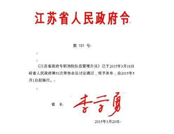近日,江蘇省省長(zhǎng)李學(xué)勇主持召開(kāi)省政府第53次常務(wù)會(huì)議,審議通過(guò)了《政府專職消防隊(duì)伍管理辦法》(以下簡(jiǎn)稱《辦法》)。自2015年5月1日起正式施行。